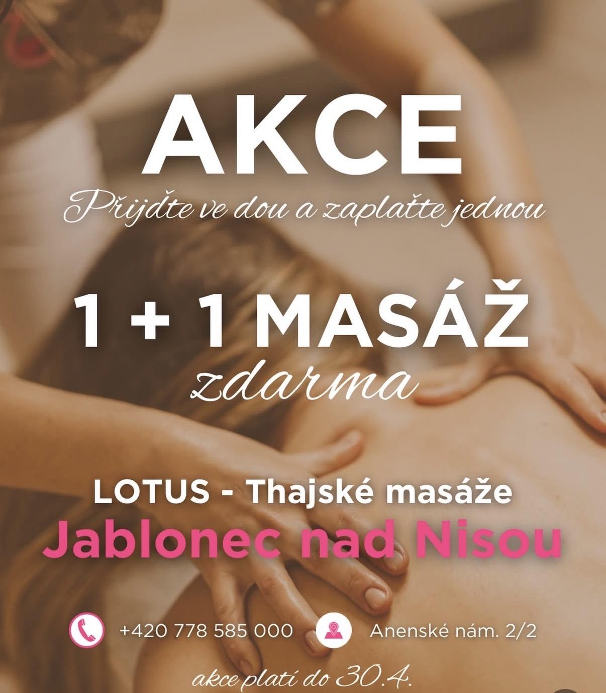 Přijdťě ve dvou a zaplaťe jednouAkce platí do 30.4. Lze využít na 1h masáž - Aroma olejová relaxační masáž/olejová/tradiční thajská/antistresová masáž zad a šíje.